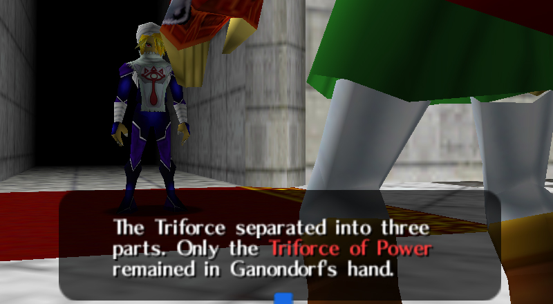 "The Triforce... the sacred triangles... it is a paradise that weighs the three forces: Power, Wisdom, and Courage. If the heart of the one who holds the sacred triangles has all three forces in balance, that one will gain the True Force to govern all.But, if that one's heart is not in balance, the Triforce will separate into three parts: Power, Wisdom, and Courage. Only one part will remain for the one who touched the Triforce... the part representing the force that one most believes in. If that one seeks the True Force, that one must acquire the two lost parts. Those two parts will be held within others chosen by destiny, who will bear the Triforce mark on the backs of their hands."
